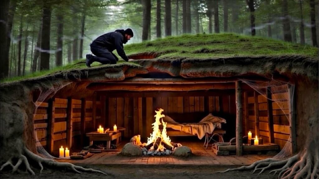 Using only hand tools, soil is slowly excavated to create a compact underground space. Logs, strong branches, and stones are used to reinforce the walls and ceiling, preventing collapse and adding durability. The entrance is kept small and camouflaged with leaves, dirt, and moss so it blends seamlessly into the forest floor. Proper drainage is essential to keep the dugout dry during rain.