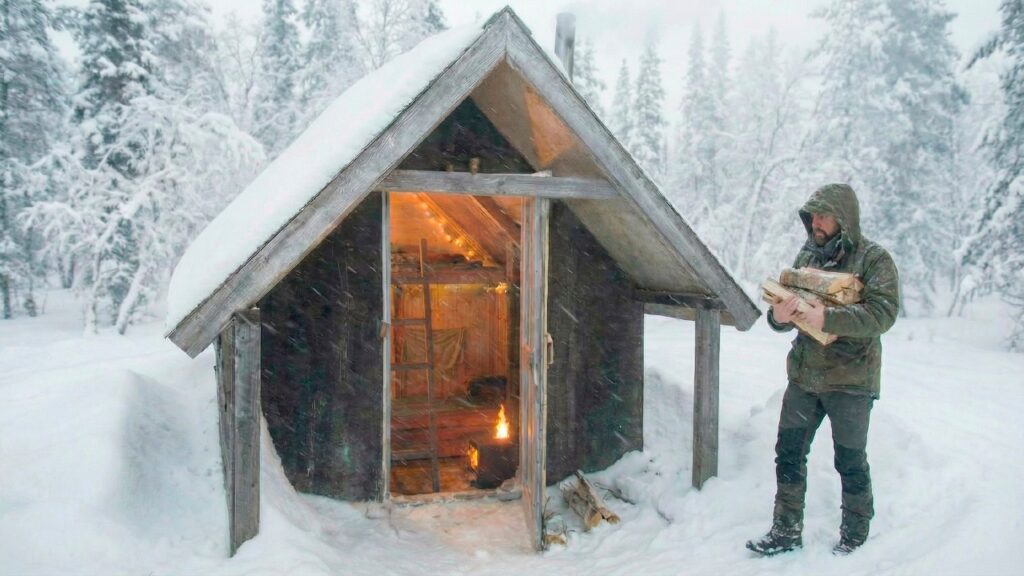 The walls are reinforced with solid timber, the roof insulated with layers of earth and moss to keep the shelter warm and dry. A small entrance blends perfectly with the surroundings, making the cabin almost invisible from the outside. Inside, the space feels surprisingly cozy. A wooden bed, a compact table, and a simple stove turn the dugout into a true forest home.