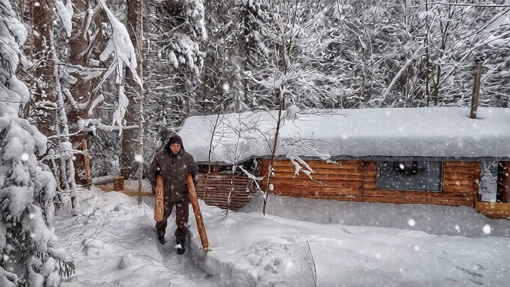 Inside the log cabin, warmth is slowly restored. A fire is lit, wood crackles, and the icy chill fades from the room. Simple tasks—stacking firewood, melting snow for water, preparing a modest meal—feel meaningful in the stillness of winter. Outside, darkness arrives early, wrapping the forest in calm and solitude.